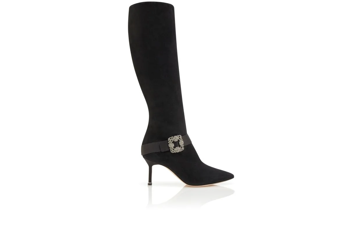 Black suede pointed toe knee high boots featuring decorative satin wrap round with a square crystal buckle, encased in a gunmetal frame. Finished with an inner side zip closure and stiletto mid heel. Upper: 85% suede, 15% satin. Sole: 100% calf leather. Lining: 100% kid leather. Heel measures 70mm. Italian sizing. Made in Italy. Product ID: 223-1451-0001