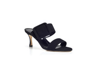 Black suede open toe mules featuring two front broad straps with an oversized decorative buckle and finished with stiletto mid heel. Upper: 100% kid suede. Sole: 100% cow leather. Lining: 100% kid leather. Heel measures 70mm. Italian sizing. Made in Italy. Product ID: 419-0479-0007