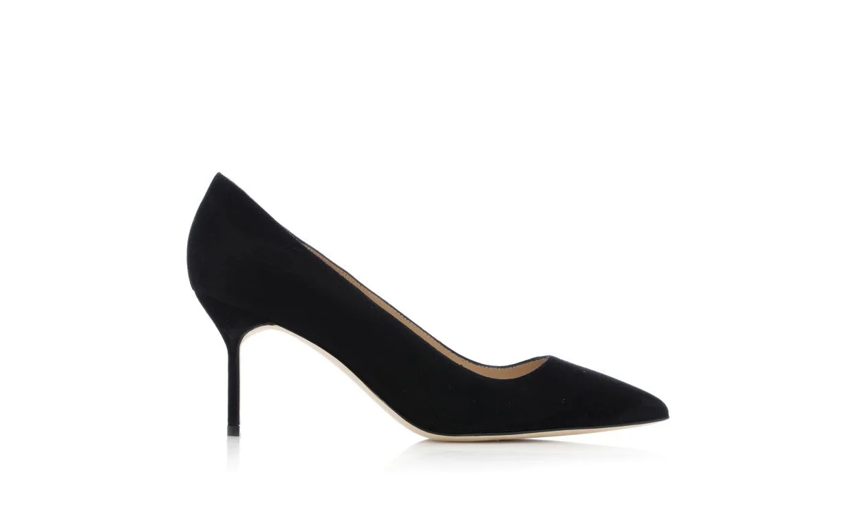 Black suede pointed toe court shoe with a stiletto mid heel. Upper: 100% kid suede. Sole: 100% cow leather. Lining: 100% kid leather. Heel measures 70mm. Made in Italy. Product ID: 9XX-0415-0013