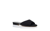 Black suede open toe flat sandals featuring ruched strap and flat stacked heel. Upper: 100% kid suede. Sole: 100% calf leather. Lining: 100% kid leather. Heel measures 10 mm. Italian sizing. Made in Italy. Product ID: 424-1992-0002
