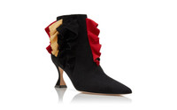 Black suede pointed toe ankle boots featuring red, black and yellow ruffled details with side zip closure. Finished with flared mid heel. Upper: 100% kid suede. Sole: 100% calf leather. Lining: 100% kid leather. Heel measures 70 mm. Italian sizing. Made in Italy. Product ID: 324-2763-0001
