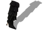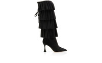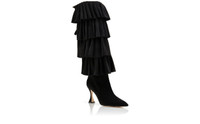 Black suede pointed toe knee high boots featuring ruffle design, decorative lace-up detail and side zip closure. Finished with stiletto flared heel. Upper: 100% kid suede. Sole: 100% calf leather. Lining: 100% kid leather. Heel measures 90 mm. Italian sizing. Made in Italy. Product ID: 324-2762-0002