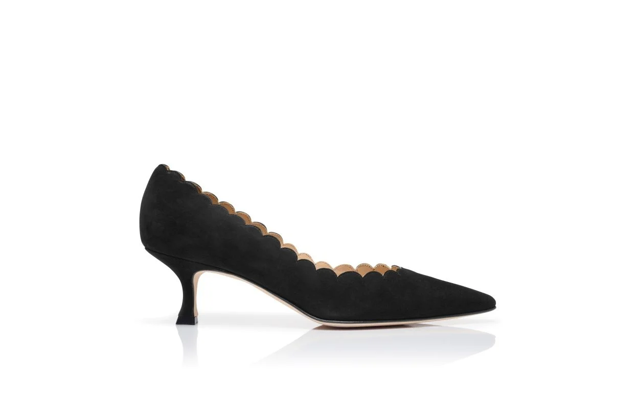 Black suede pointed toe pumps featuring scalloped edging and stiletto low heel. Upper: 100% kid suede. Sole: 100% calf leather. Lining: 100% kid leather. Heel measures 50 mm. Italian sizing. Made in Italy. Product ID: 120-1218-0002