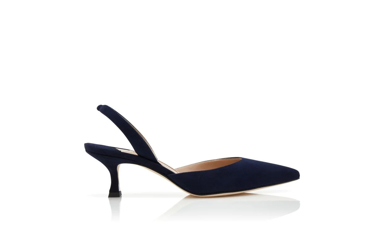 Navy blue suede slingback pumps featuring an almond toe and stiletto kitten heel. Upper: 100% kid suede. Sole: 100% cow leather. Lining: 100% goat skin. Heel measures 50mm. Italian sizing. Made in Italy. Product ID: 9XX-0401-0020