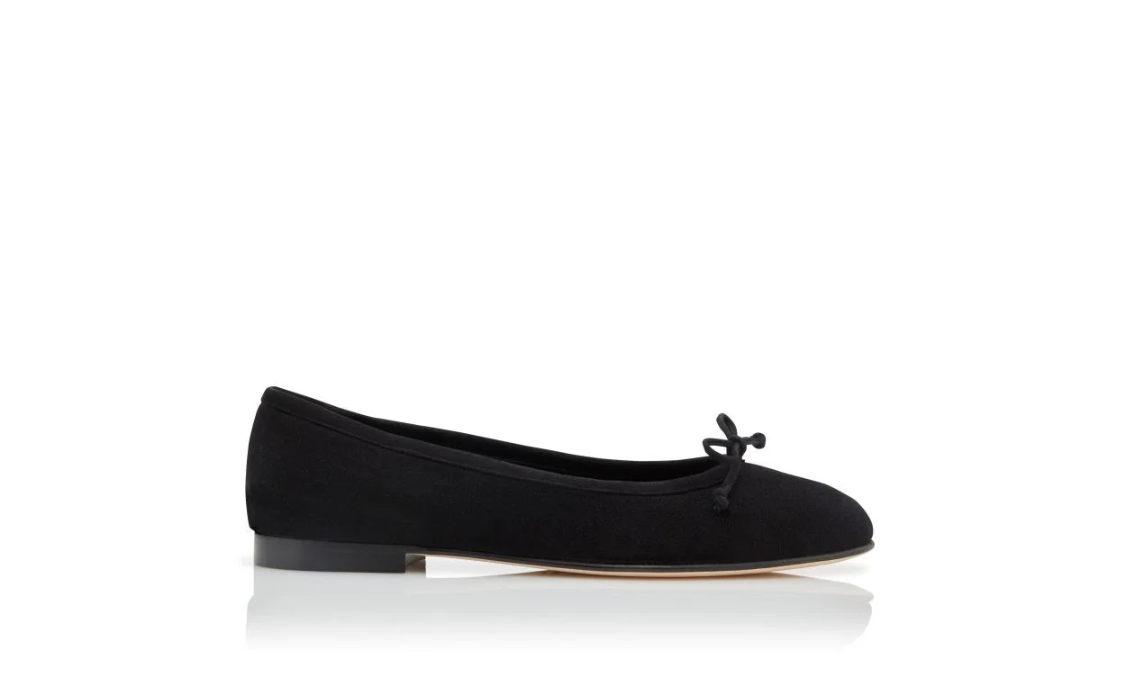 Black suede round toe ballerina flats featuring decorative bow detail, slip-on design and flat stacked heel. Upper: 100% kid suede. Sole: 100% calf leather. Lining: 100% kid leather. Heel measures 10 mm. Italian sizing. Made in Italy. Product ID: 223-1336-0009