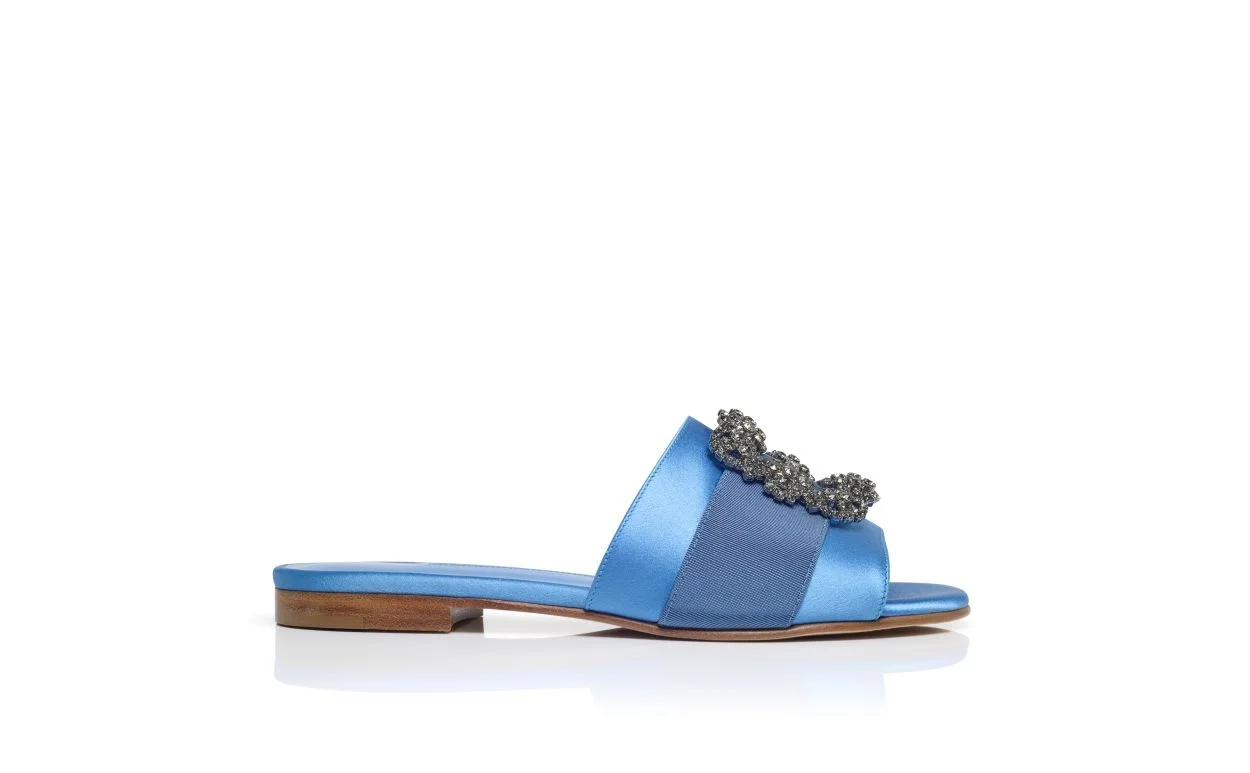 Blue satin flat sandals featuring grosgrain trim, square crystal buckle and flat stacked heel. Upper: 68% viscose, 32% silk. Sole: 100% calf leather. Lining: 100% kid leather. Heel measures 10 mm. Made in Italy. Product ID: 218-0049-0042