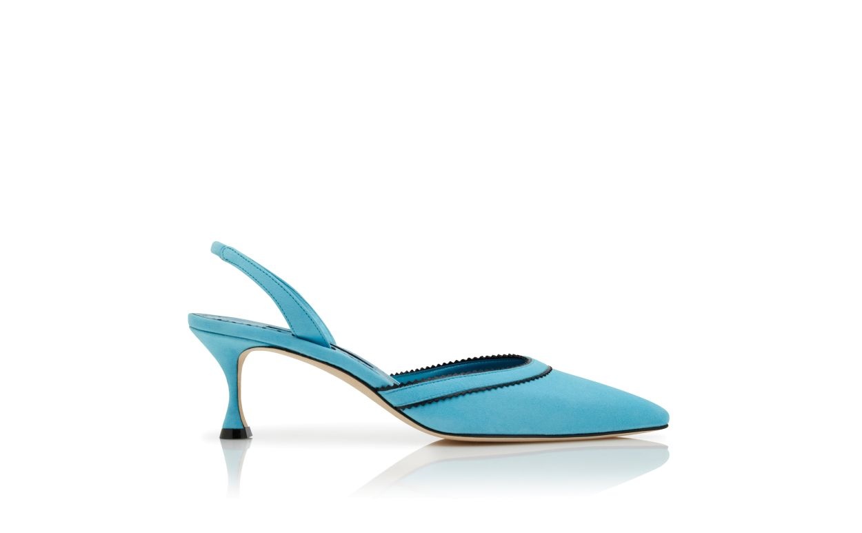 Blue suede pointed toe slingback pumps featuring black nappa leather zig zag pinking details and elasticated slingback design. Finished with flared low heel. Upper: 95% kid suede, 5% lamb nappa. Sole: 100% calf leather. Lining: 100% kid leather. Heel measures 50 mm. Italian sizing. Made in Italy. Product ID: 324-2755-0003