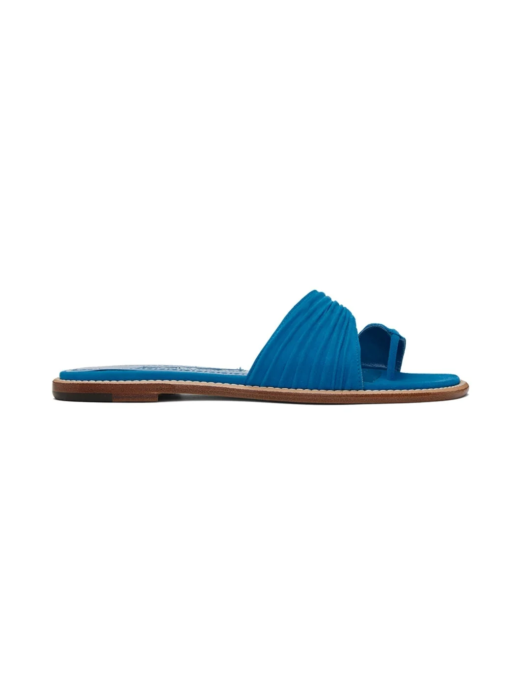 Handcrafted suede slip-on sandals in blue. · Single toe strap · Gathering at vamp · Logo patch at leather footbed · Kidskin lining · Stacked leather heel with rubber injection · Calfskin suede sole Supplier color: Blue Leather. Made in Italy 241140F124001