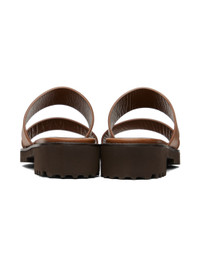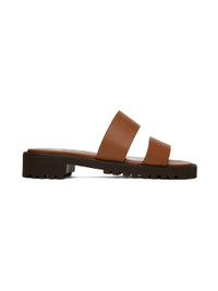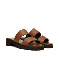 Buffed calfskin slip-on sandals in brown. · Open round toe · Logo patch at padded goatskin footbed · Treaded foam rubber sole Supplier color: Brown