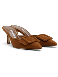 Handcrafted goatskin suede slip-on heeled sandals. · Pointed toe · Covered buckle hardware at vamp · Inset logo patch at padded footbed · Buffed kidskin lining · Covered stiletto heel with rubber injection · Calfskin nubuck sole · Heel: H2.75" Supplier color: Medium brown Upper: goatskin. Sole: calfskin. Made in Italy 252140F122007