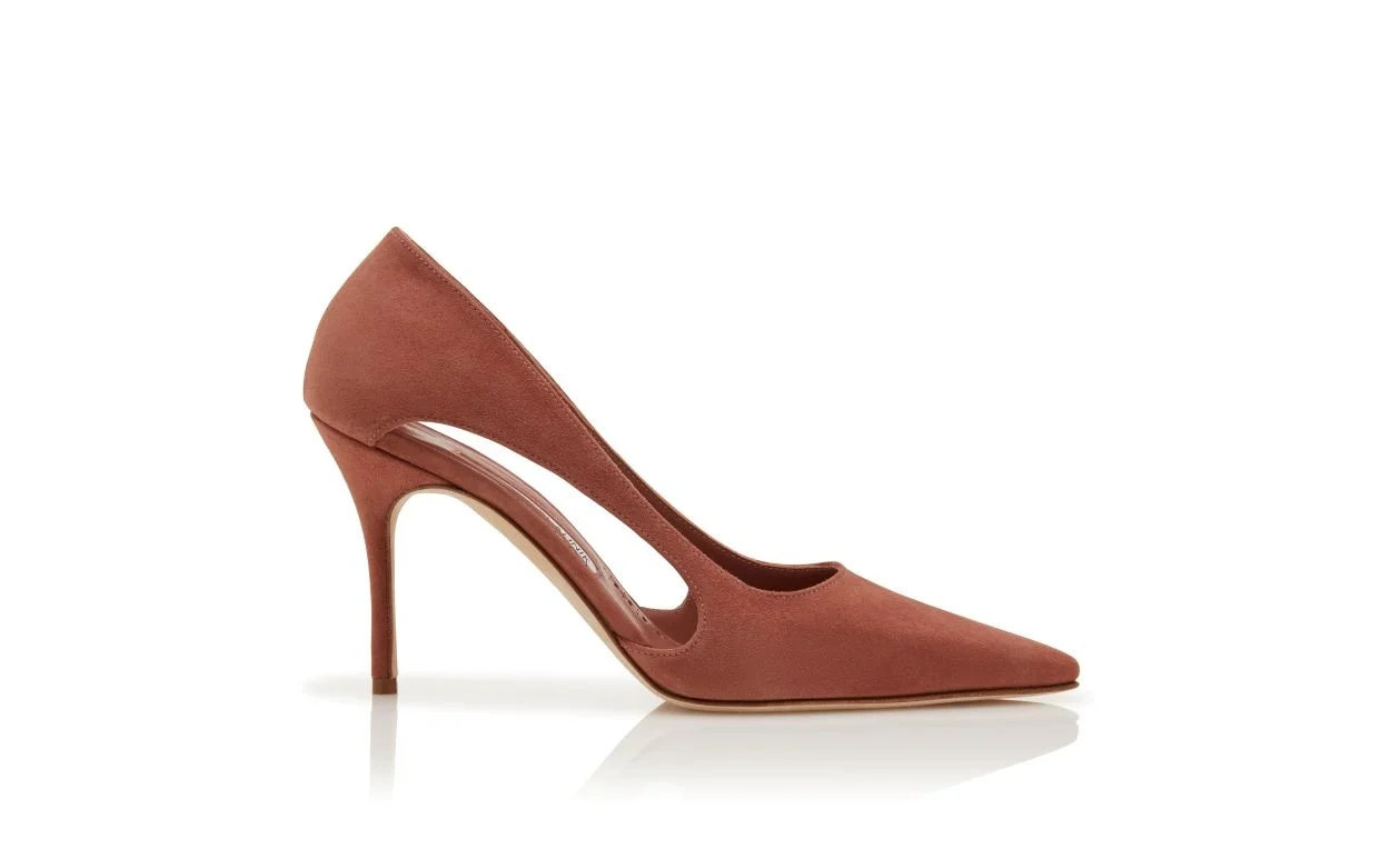 Brown suede pointed toe pumps featuring cut out details and stiletto high heel. Upper: 100% kid suede. Sole: 100% calf leather. Lining: 100% kid leather. Heel measures 90 mm. Italian sizing. Made in Italy. Product ID: 225-1803-0001