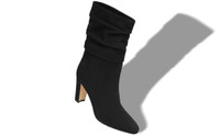 Black suede slip-on knee high boots featuring block high heel. Upper: 100% calf suede. Sole: 50% rubber, 50% calf leather. Lining: 100% kid leather. Heel measures 90 mm. Italian sizing. Made in Italy. Product ID: 321-1919-0001