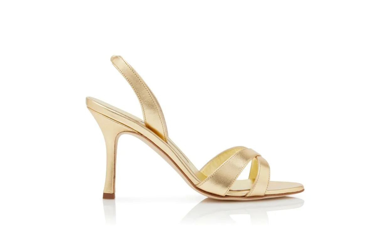 Gold nappa leather open toe slingback sandals featuring crossover straps and stiletto high heel. Upper: 100% lamb nappa. Sole: 100% calf leather. Lining: 100% kid leather. Heel measures 90 mm. Italian sizing. Made in Italy. Product ID: 124-2734-0001