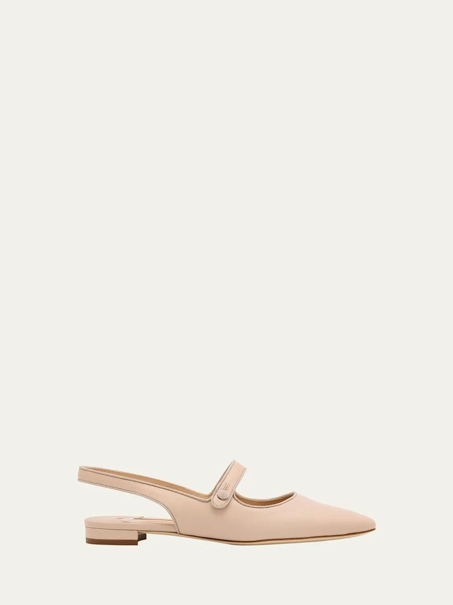 Manolo Blahnik smooth leather ballerina flats 0.25 in / 10 mm flat heel Almond toe Mary Jane button strap Slingback strap Leather outsole Lining: Leather Made in Italy