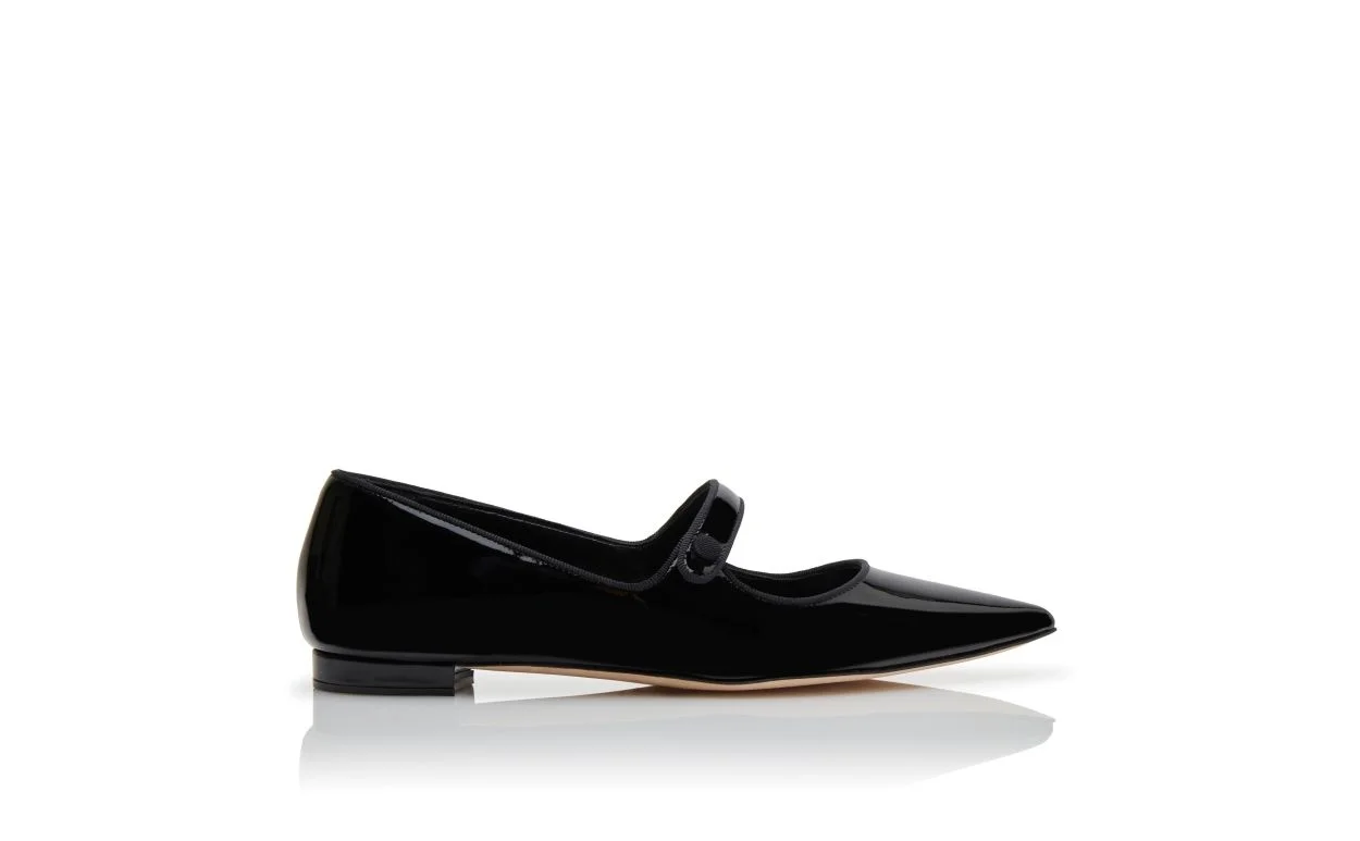 Black patent leather pointed toe Mary Jane flat pumps featuring front strap with black button closure, black grosgrain edging and flat stacked heel. Upper: 90% patent calf, 10% fabric. Sole: 100% calf leather. Lining: 100% kid leather. Heel measures 10 mm. Italian sizing. Made in Italy. Product ID: 123-2426-0002