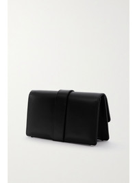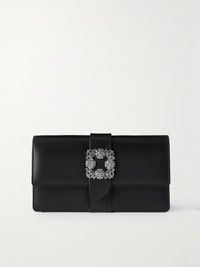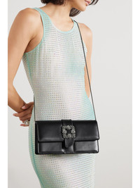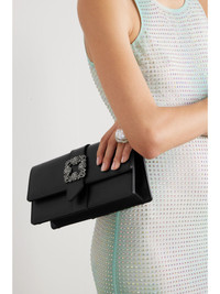 Black satin rectangular clutch bag featuring flap-over design and crystal buckle. Contains internal compartment, mirror and removable chains with two length options. Magnetic closure. Outer: 68% viscose, 32% silk. Lining: 68% viscose, 32% silk. Made in Italy. Height: 12 cm Length: 24 cm Width: 6 cm. Straps measure 37 cm and 110 cm. Product ID: 9XX-0792-0037