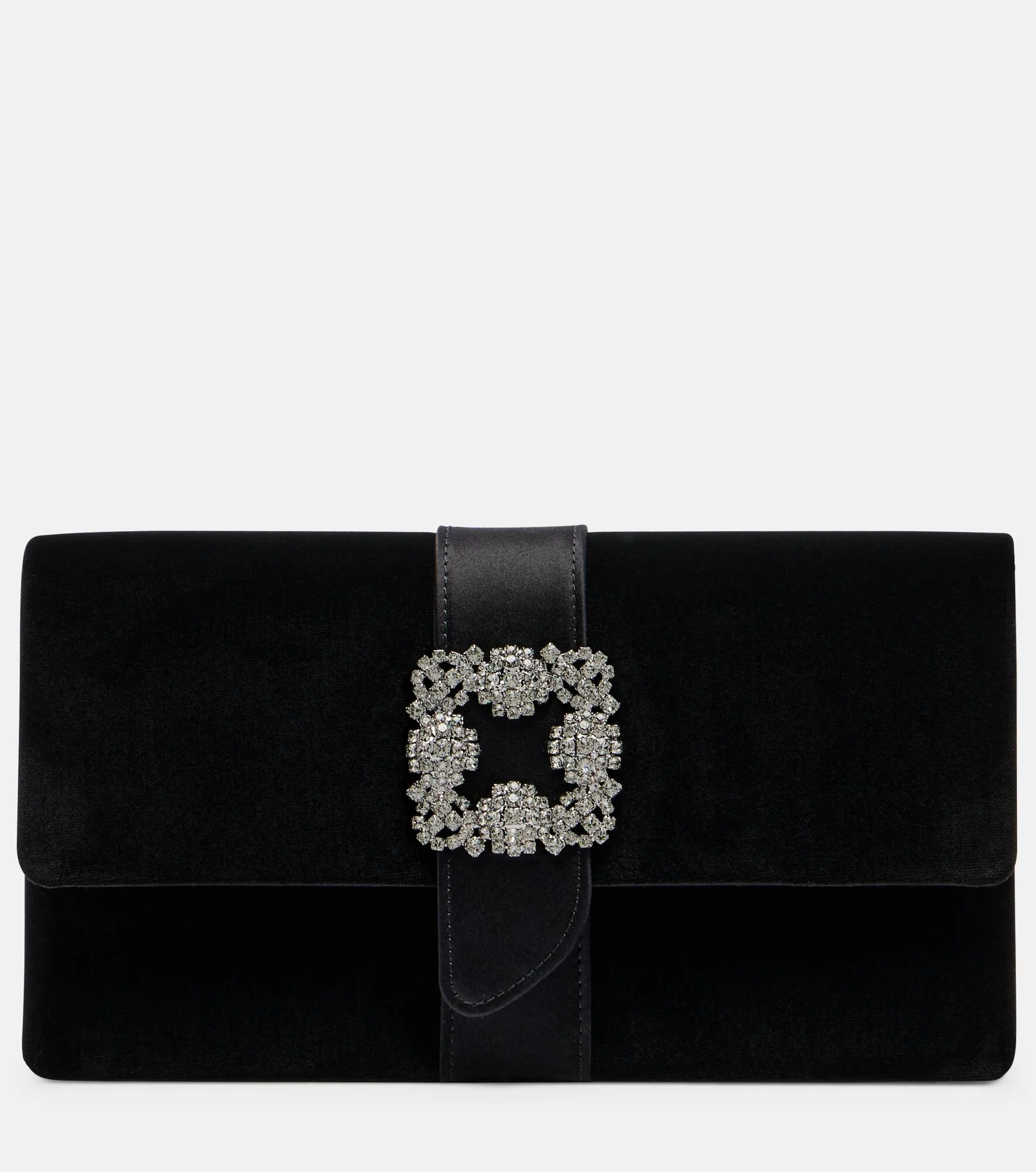 When elegant events beckon, there's no better companion than the Capri clutch from Manolo Blahnik. The rectangular bag is crafted from velvet and is enriched by a dazzling crystal buckle. It comes with a chain strap for hands-free carry. Product Details - Material: velvet - Lining: satin - Made in Italy - Color: black - Designer color name: Blck(0015) - Item color: black - Hardware color: silver - Closure: magnetic fastening - Internal details: internal slot pocket - Detachable chain shoulder strap - Includes: detachable mirror, dust bag - Item number: P01103946 Size & Fit - Height 13,5cm-5.5" - Width 24,5cm-9.5" - Max. depth 6cm-2.5" - Chain length 44/114cm-17.5/45"