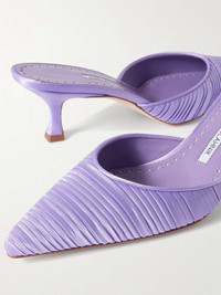 EDITORS'NOTES Manolo Blahnik’s ‘Carolyne’ mules debuted in the ‘80s, and the point-toe design feels just as sleek and timeless today. This updated version has been crafted in Italy from leather-trimmed, lustrous satin in a pleated finish and set on 50mm fluted kitten heels. SIZE & FIT - Fits true to size, take your normal size - Italian sizing DETAILS & CARE - Heel measures approximately 50mm/ 2 inches - Lavender satin and leather (Cow) - Slip on