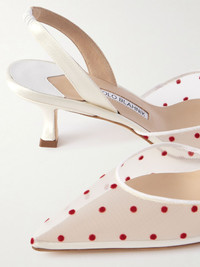 Manolo Blahnik's shoes begin as a freehand sketch painted by the founder himself using vibrant watercolors. Made in Italy from mesh and satin, these 'Carolyne' pumps have flocked polka-dots, elegant pointed toes and flexible slingback straps. Their 50mm kitten heels ensure a comfortable fit. Size & Fit - Fits true to size, take your normal size - Italian sizing Details & Care - Heel measures approximately 50mm/ 2 inches - White mesh and satin - Slingback strap