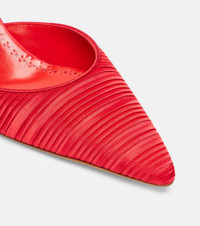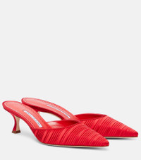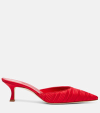 Finish looks on a vibrant note with the Carolyne mules from Manolo Blahnik. The pair is crafted from pleated satin and sits atop 50mm heels. Product Details - Upper: satin - Lining: leather - Sole: leather insole and sole - Toe shape: pointed toe - Handmade in Italy - Includes: dust bag, shoe box - Designer color name: 994B Yoth - Item color: red - Item number: P01082315 Size & Fit - True to size - Slightly wide at the toe - European sizes - 5cm-2" heel (size EU 38)