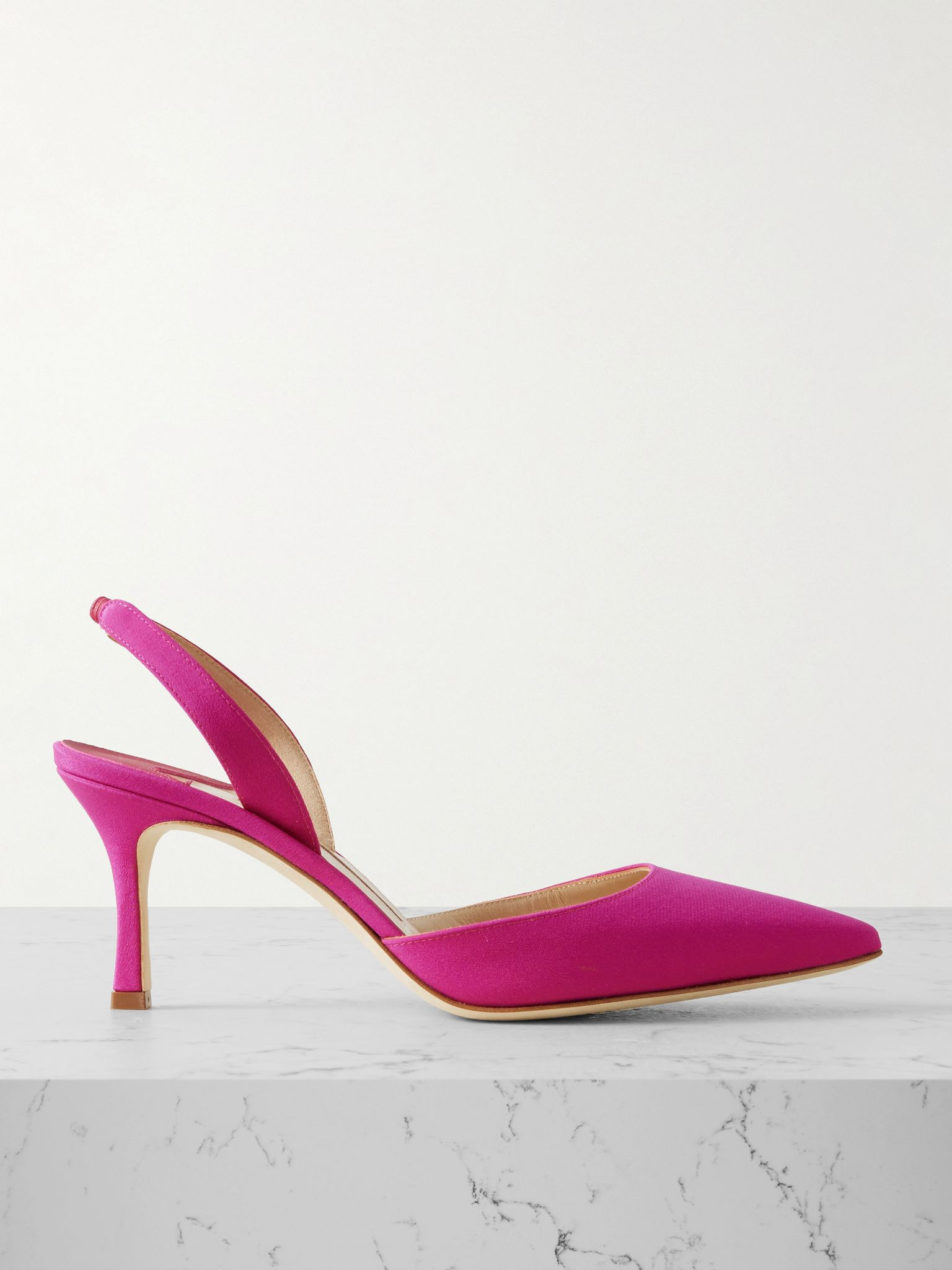 Manolo Blahnik's shoes begin life as a freehand sketch painted by the founder himself using vibrant watercolors. Made in Italy from silk crepe de chine, these 'Carolyne' pumps have elegant pointed toes, flexible slingback straps and 70mm kitten heels for a comfortable fit. Size & Fit - Fits true to size, take your normal size - Italian sizing Details & Care - Heel measures approximately 70mm/ 3 inches - Fuchsia silk crepe de chine - Elasticated slingback strap