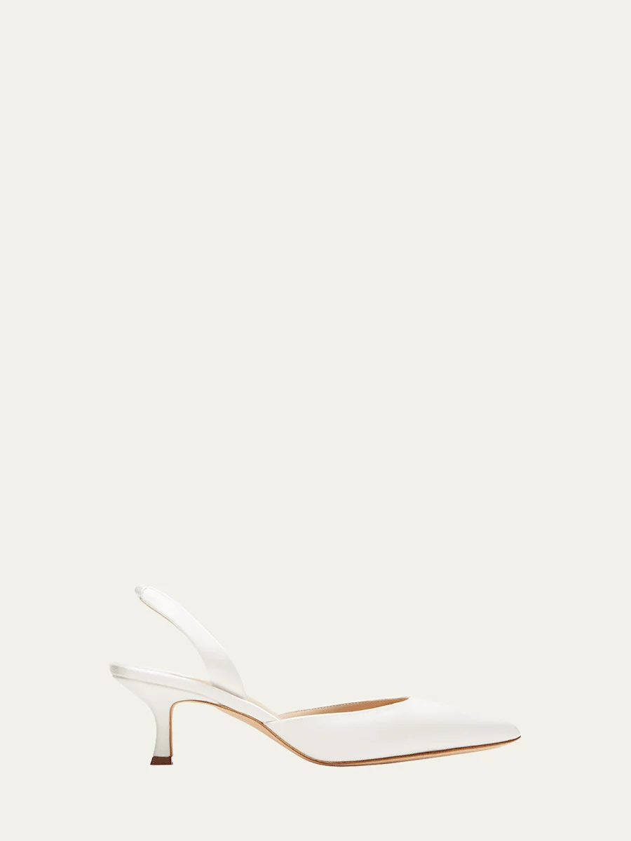Manolo Blahnik "Carolyne" silk pumps 2.00 in / 50 mm stiletto kitten heel Pointed toe Stretch halter slingback Leather outsole Lining: Goat leather Made in Italy