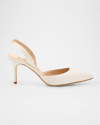 Manolo Blahnik "Carolyne" satin pumps 2.75 in / 70 mm stiletto heel Pointed toe Stretch slingback strap Leather outsole Lining: Goat leather Made in Italy