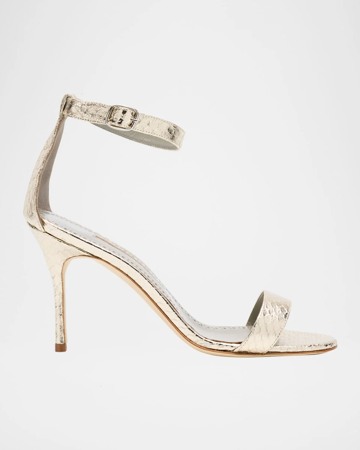 Manolo Blahnik "Chaos" pumps in metallic snakeskin 3.50 in / 90 mm stiletto heel Round open toe Single band vamp Buckle ankle strap Goat leather lining Leather outsole Made in Italy