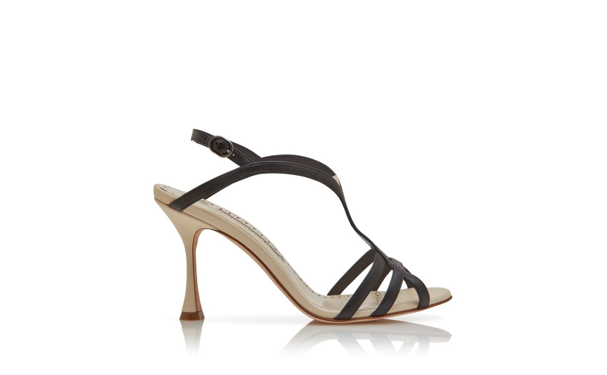 Cream nappa leather open toe sandals featuring black straps with ankle strap closure and flared high heel. Upper: 100% lamb nappa. Sole: 100% calf leather. Lining: 100% kid leather. Heel measures 90 mm. Italian sizing. Made in Italy. Product ID: 125-2798-0001