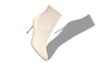 Cream calf leather round toe ankle boot featuring side zip closure and stiletto high heel. Upper: 100% calf leather. Sole: 100% calf leather. Lining: 100% kid leather. Heel measures 90mm. Italian sizing. Made in Italy. Product ID: 319-1187-0003