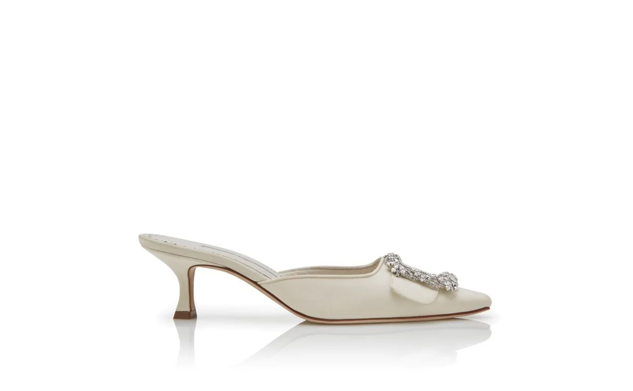 Cream Crepe de Chine mules featuring square crystal buckle, almond toe and kitten heel. Upper: 100% silk. Sole: 100% cow leather. Lining: 100% kid leather. Heel measures 50mm. Made in Italy. Product ID: 118-0115-0001