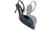 Dark blue chambray pointed toe pumps featuring decorative buckle detail, woven design and elasticated slingback design. Finished with stiletto mid heel. Upper: 100% cotton. Sole: 100% calf leather. Lining: 100% kid leather. Heel measures 70 mm. Italian sizing. Made in Italy. Product ID: 225-1984-0001