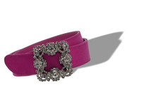 Dark fuchsia satin belt featuring a moveable square crystal buckle with a push stud fastening. Upper: 68% viscose, 32% silk. Lining: 100% nappa leather. Made in Italy. Product ID: 118-0131-0014