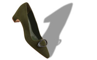 Dark green suede pointed toe pumps featuring circular buckle and low block heel. Upper: 100% kid suede. Sole: 100% calf leather. Lining: 100% kid leather. Heel measures 50 mm. Italian sizing. Made in Italy. Product ID: 225-1857-0001