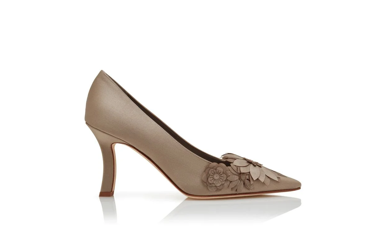 Dark grey crepe satin pointed toe pumps featuring laser-cut floral design and angular high heel. Upper: 100% silk.Sole:100% calf leather.Lining:100% kid leather.Heel measures:90 mm.Italian sizing. Made in Italy. Product ID: 325-3070-0001