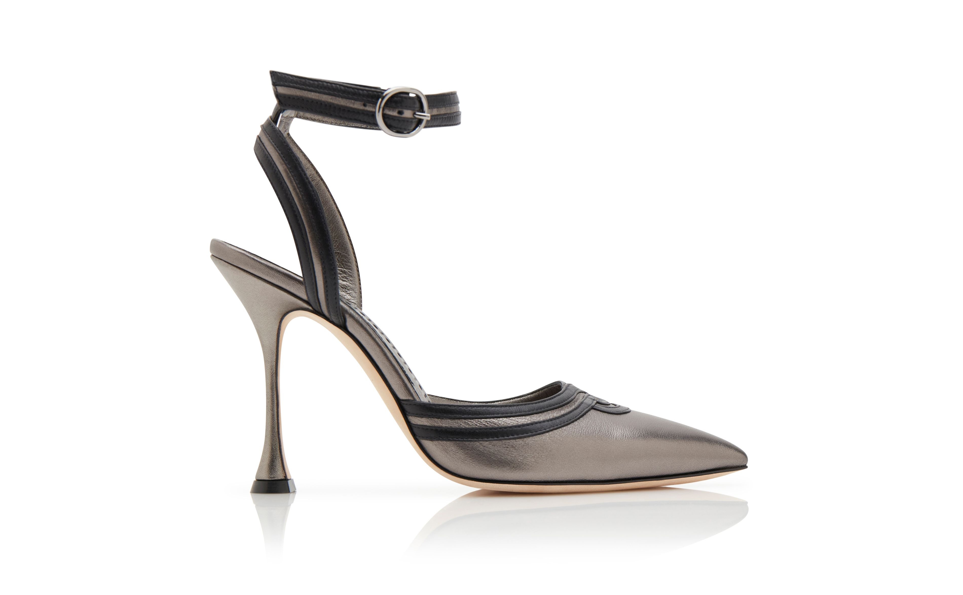 Dark grey nappa leather pointed toe pumps featuring black leather swirl detail and adjustable ankle strap closure. Finished with stiletto high heel. Upper: 100% nappa leather. Sole: 100% calf leather. Lining: 100% kid leather. Heel measures 105mm. Italian sizing. Made in Italy. Product ID: 223-1356-0001