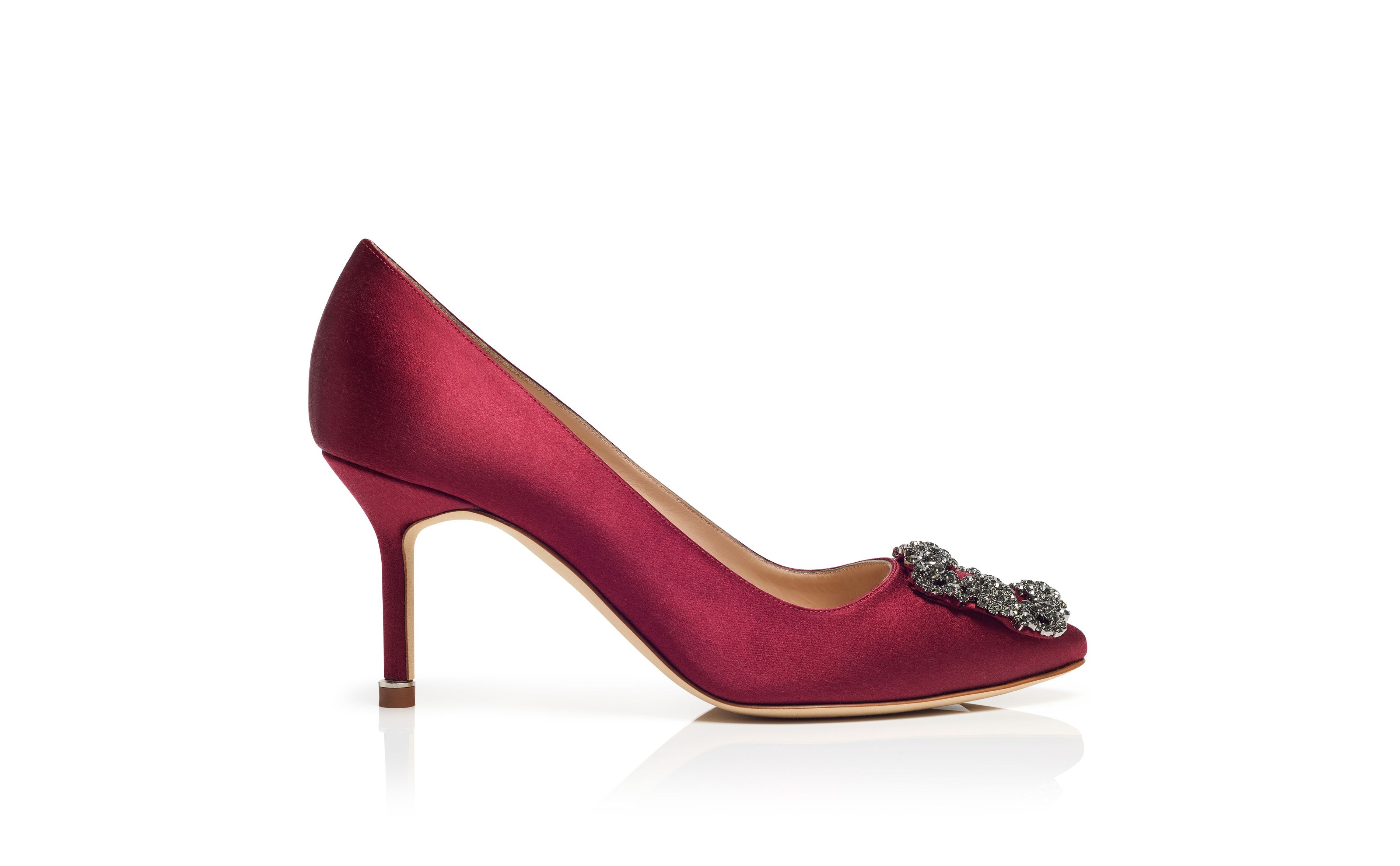 Dark red satin almond toe pumps featuring a square crystal buckle encased in a gunmetal frame. Finished with a stiletto mid heel. Upper: 72% viscose, 28% silk. Sole: 100% calf leather. Lining: 100% kid leather. Heel measures 70mm. Italian sizing. Made in Italy. Product ID: 9XX-0662-0049