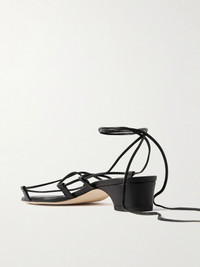 Manolo Blahnik's shoes are crafted in Italy with meticulous attention to detail. These leather 'Dellasan' sandals have slender crossover straps that tie at the ankle. They rest on sculptural 30mm block heels and look just as chic styled with dresses or jeans. Details & Care - Heel measures approximately 30mm/ 1 inch - Black leather (Lamb) - Ties-fastening ankle strap