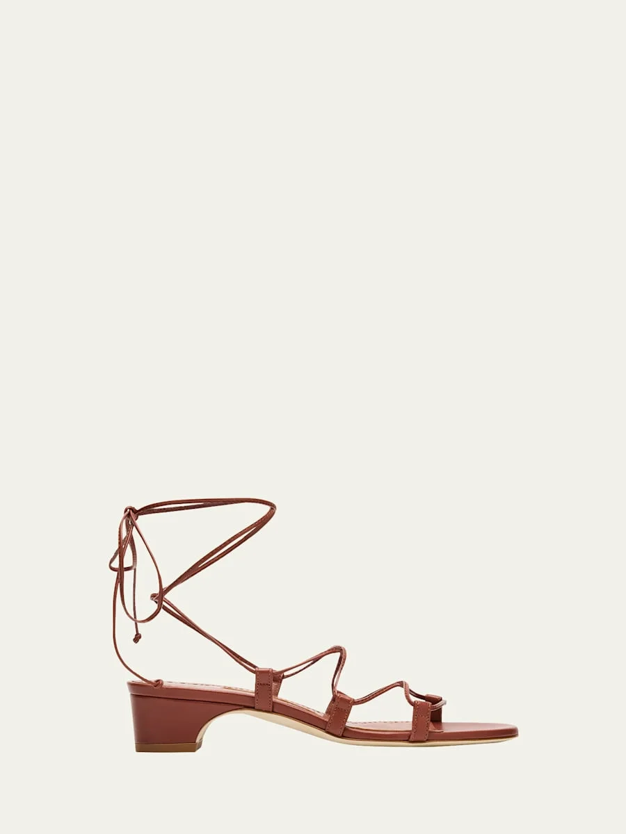 Manolo Blahnik "Dellasan" strappy goatskin leather sandals 1.25 in / 30 mm kitten heel Open toe Lace-up vamp Self-tie ankle strap Leather outsole Lining: Goat leather Made in Italy Online Inquiries: BGS21_X6WMA| Store Inquiries: #5025811