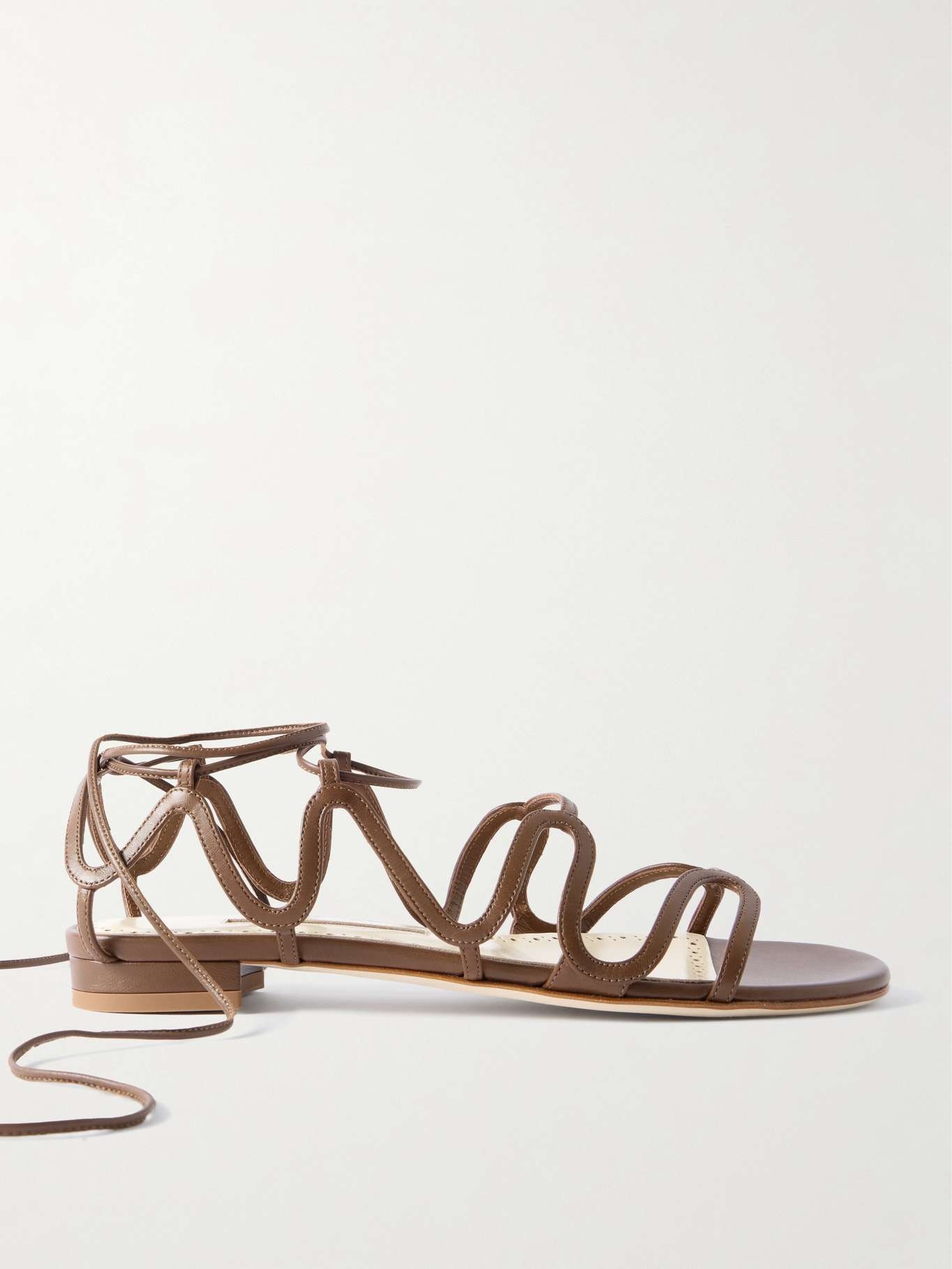 Manolo Blahnik's 'Fawdaflat' sandals are a modern take on classic gladiator styles. Crafted in Italy from leather, they have slim straps that frame your foot and wrap around your ankle. Size & Fit - Fits true to size, take your normal size - Italian sizing Details & Care - Heel measures approximately 10mm/ 0.5 inches - Beige leather (Lamb) - Ties at ankle