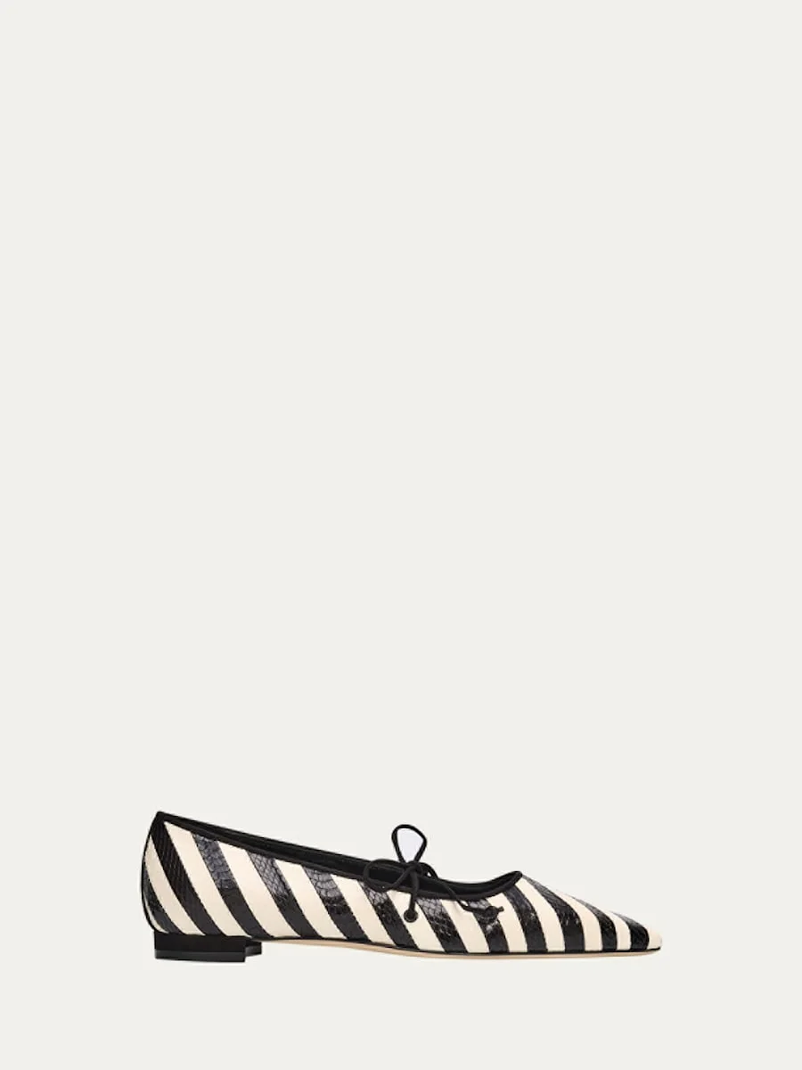 Manolo Blahnik's "Federica" ballerina flats are crafted from embossed striped leather 0.25 in / 10 mm flat heel Pointed toe Laceup vamp Leather lining and outsole Made in Italy