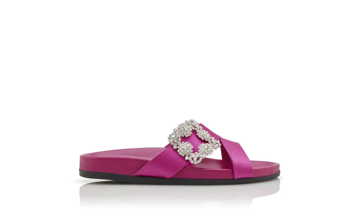 Fuchsia satin open toe flat mules featuring crossover straps with decorative clear crystal buckle. Finished with flat rubber sole. Upper: 72% viscose, 28% silk. Sole: 100% rubber. Lining: 100% kid leather. Heel measures 10mm. Italian sizing. Made in Italy. Product ID: 123-2425-0006