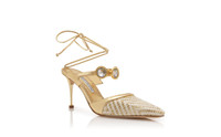 Gold nappa leather almond toe ankle strap pumps featuring light beige and white laminated herringbone raffia detailing and instep strap embellished with three rounded clear crystal stones. Finished with ankle-tie closure and a stiletto high heel. Upper:55% lamb nappa, 45% fabric.Sole:100% calf leather.Lining:100% kid leather.Heel measures:90 mm.Italian sizing. Made in Italy. Product ID: 126-3119-0001