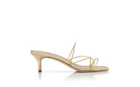 Gold nappa leather open toe mules featuring thin front strap detailing and stiletto low heel. Upper: 100% lamb nappa. Sole: 100% calf leather. Lining: 100% kid leather. Heel measures 50 mm. Italian sizing. Made in Italy. Product ID: 224-1685-0001