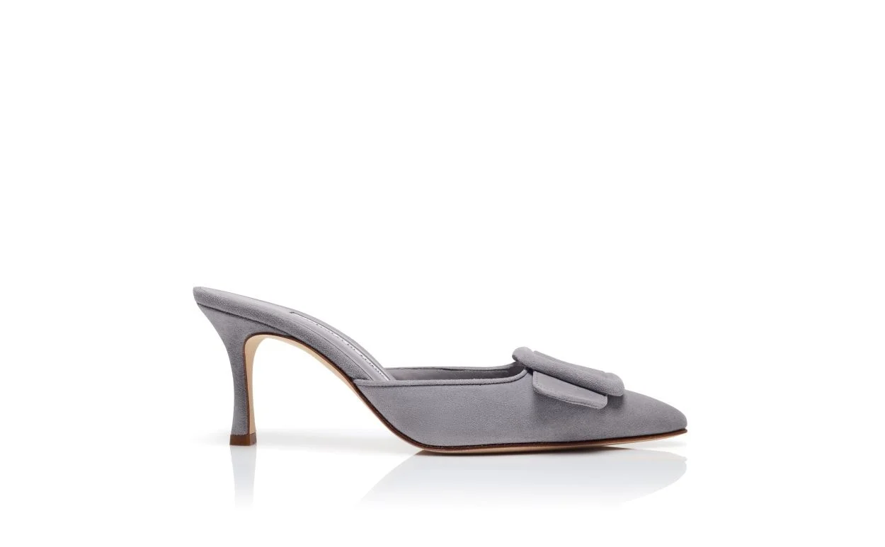 Grey suede almond toe mules featuring decorative buckle detail and stiletto mid heel. Upper: 100% kid suede. Sole: 100% calf leather. Lining: 100% kid leather. Heel measures 70 mm. Italian sizing. Made in Italy. Product ID: 9XX-0247-0062