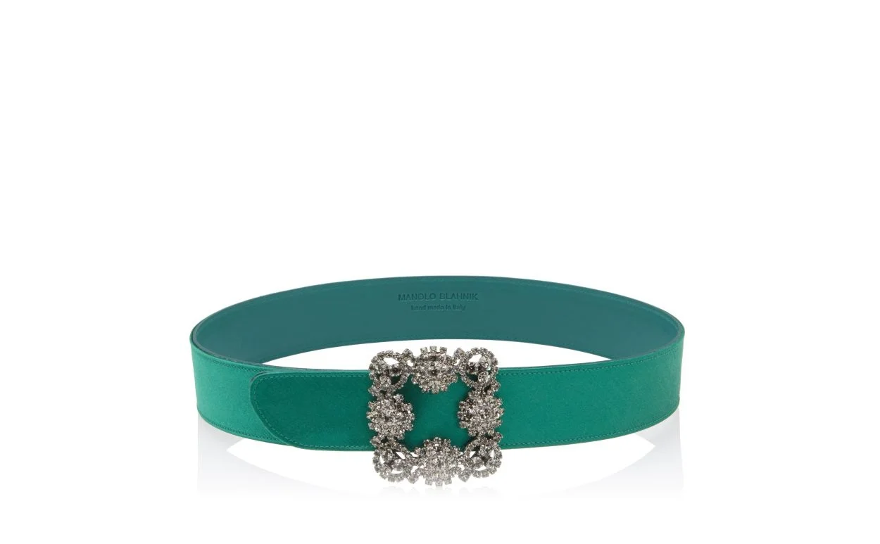 Green satin belt featuring a moveable square crystal buckle with a push stud fastening. Upper: 68% viscose, 32% silk. Lining: 100% nappa leather. Made in Italy. Product ID: 118-0131-0006