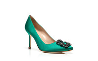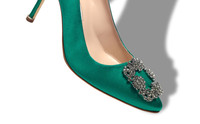 Green satin almond toe pumps featuring square crystal buckle encased in a gunmetal frame. Finished with a stiletto high heel. Upper: 72% viscose, 28% silk. Sole: 100% calf leather. Lining: 100% kid leather. Heel measures 90mm. Italian sizing. Made in Italy. Product ID: 9XX-0663-0046