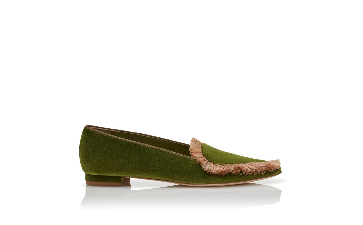 Green velvet round toe loafers featuring multicoloured fringing details and flat stacked heel. Upper:100% velvet.Sole:100% calf leather.Lining:100% kid leather.Heel measures:10 mm. Italian sizing. Made in Italy. Product ID: 325-3065-0001