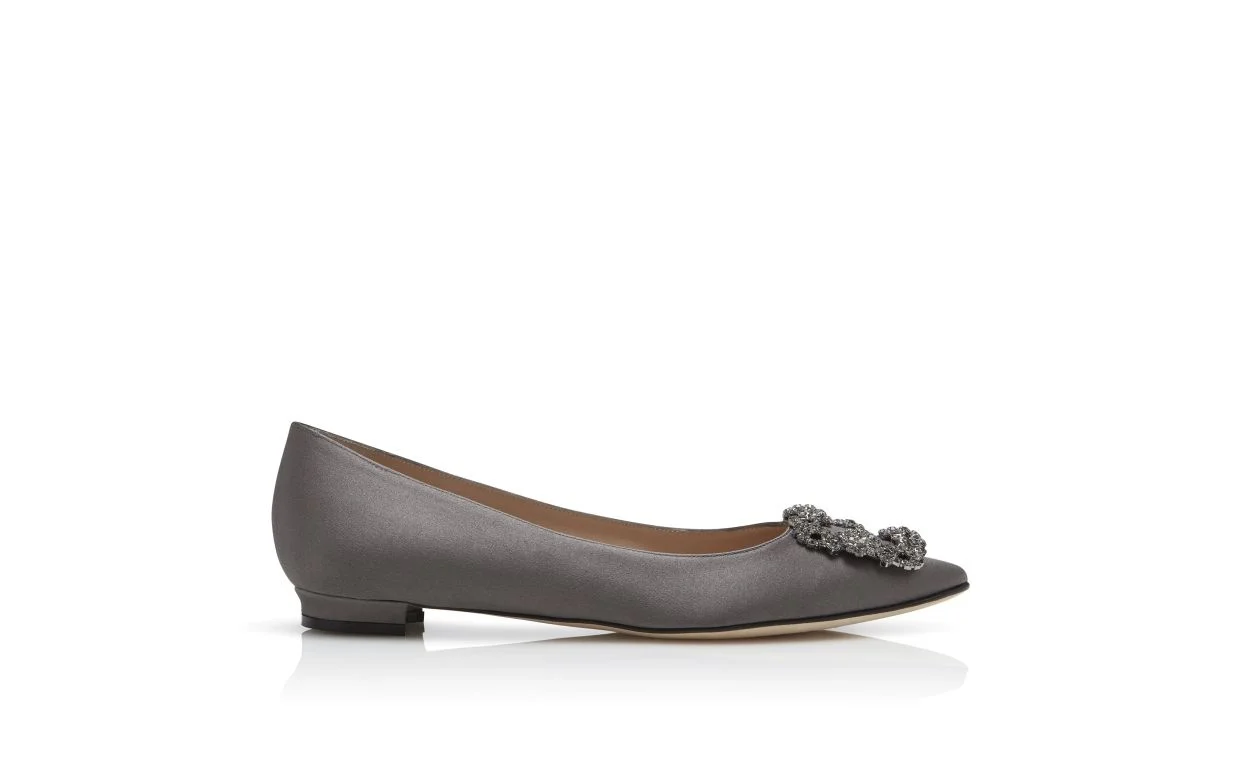 Grey satin almond toe flat pumps finished with a square crystal buckle encased in a gunmetal frame. Upper: 68% viscose, 32% silk. Sole: 100% cow leather. Lining: 100% kid leather. Heel measures 10 mm. Italian sizing. Made in Italy. Product ID: 9XX-0348-0054