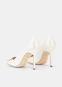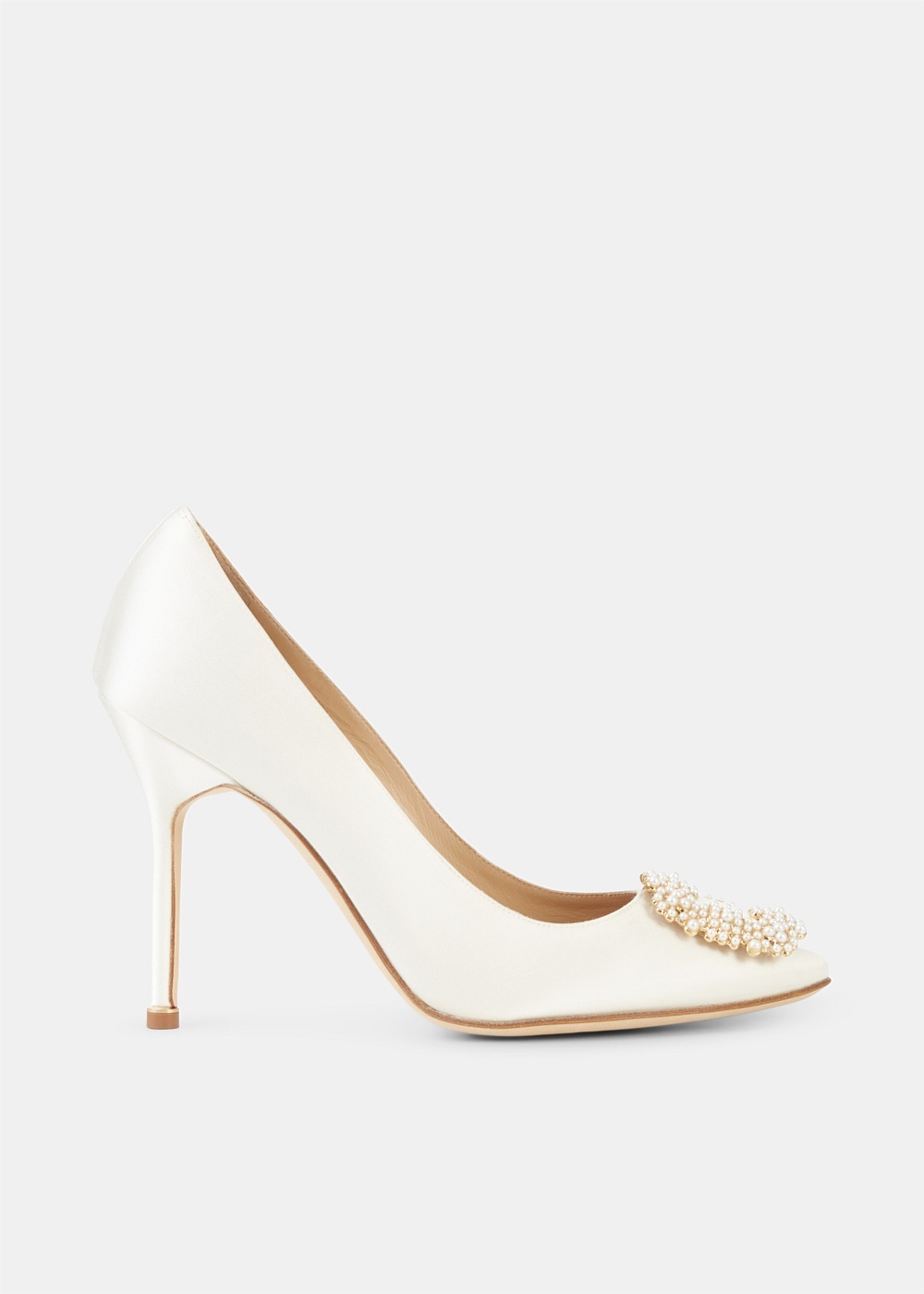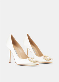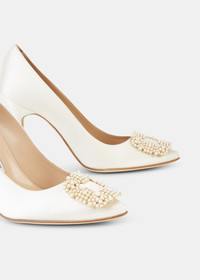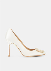 Manolo Blahnik captures the essence of elegance and sophistication throughout each of Blahnik's curated collections. A favoured style amongst all, Manolo Blahnik's signature Hangisi court shoe is an ode to Napoleon I, Josephine and Pauline Bonaparte. Arriving in a modern cream hue, Manolo Blahnik's latest Hangisi pump is complete with a crystal embellished buckle resting upon a chic pointed toe. These modern pumps are will seamlessly complement any bridal or evening event. Supplier code: 1051180134 PRODUCT FEATURES - Almond toe - Fine heel - Logo detailed insole - Crystal encrusted buckle - Made in Italy SIZE & FIT - This item fits true to size. We recommend ordering your regular size PRODUCT MEASUREMENTS - Heel height: 105mm